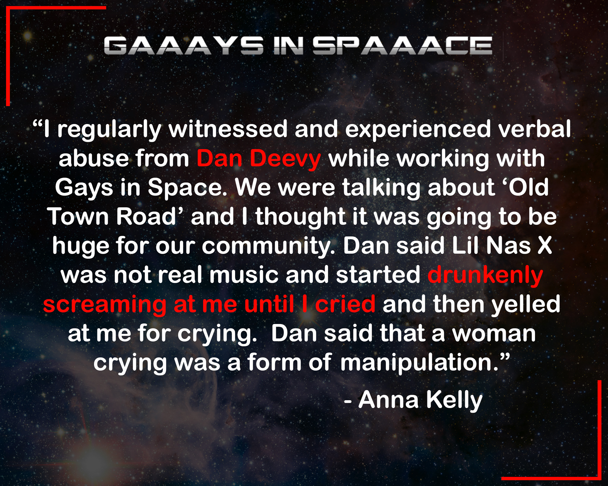 We will update this website with more information as we collect it and if you have information on the incident Deevy is eluding to please contact our tip line lies@gaysinspace.org.