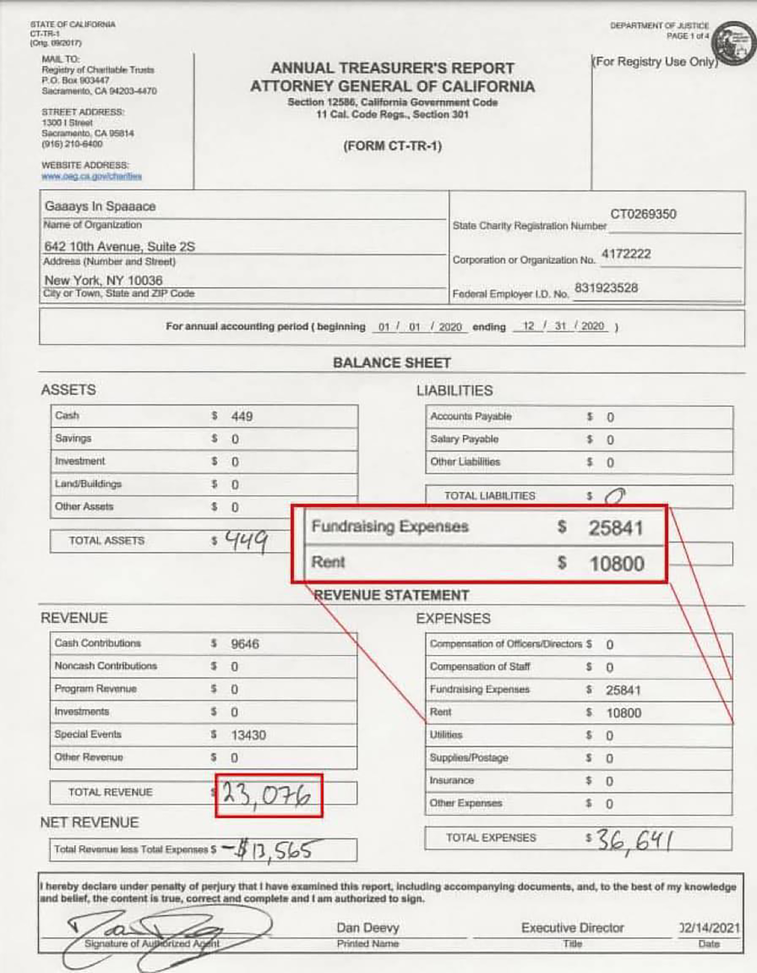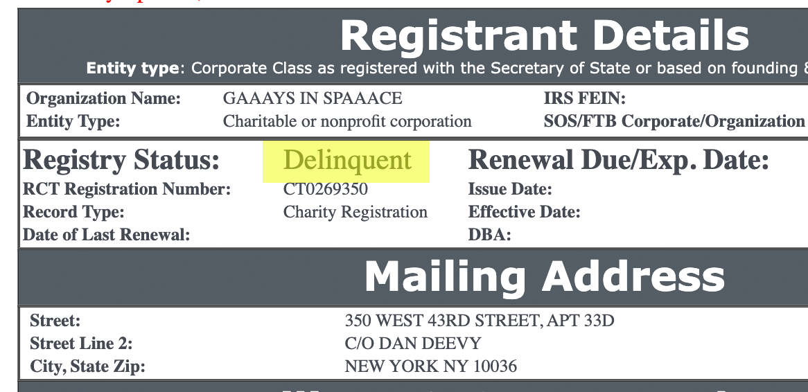 Surprisingly, Deevy does admit here that he filed his non-profit paperwork late, which is an oversimplification of just how badly delinquent Deevy’s paperwork is. Gays In Space had their non-profit status fully revoked by the IRS in 2021 and had to operate under the fiscal sponsorship of the 501(c)3 Foundation For The Future. Gays In Space were reinstated federally but are now delinquent in California. Per California non-profit laws (where they are filed) they may not legally operate or solicit while delinquent. Dan knows this but ignores the law and operates illegally.
