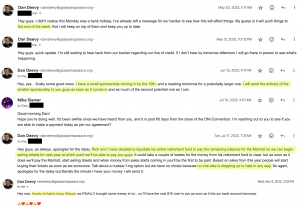 This email promise reminds me heavily of the exchange regarding the unpaid A/V services for Dan Deevy and Rich Hart’s wedding in 2023 that was paid for using charity funds. Deevy still owes over $10,000 to the A/V vendor and made similar promises to them in July of 2023, promising “Rich and I have decided to liquidate his entire retirement fund to pay the remaining balance for the Marriott so we can begin selling tickets for next year at which point we’ll be able to pay you guys.” Here we are three years later and that A/V vendor was still never paid.