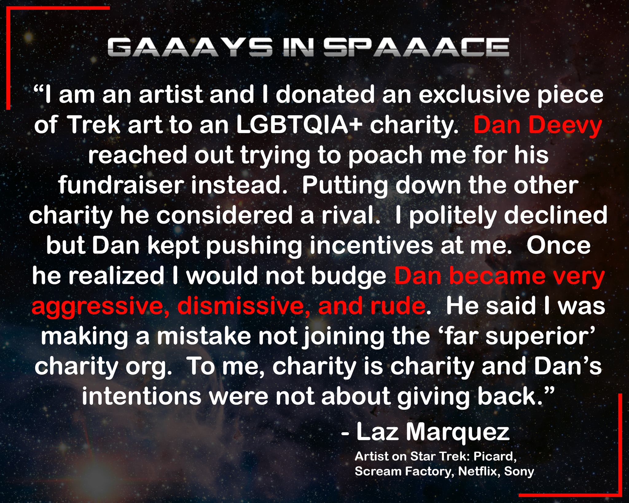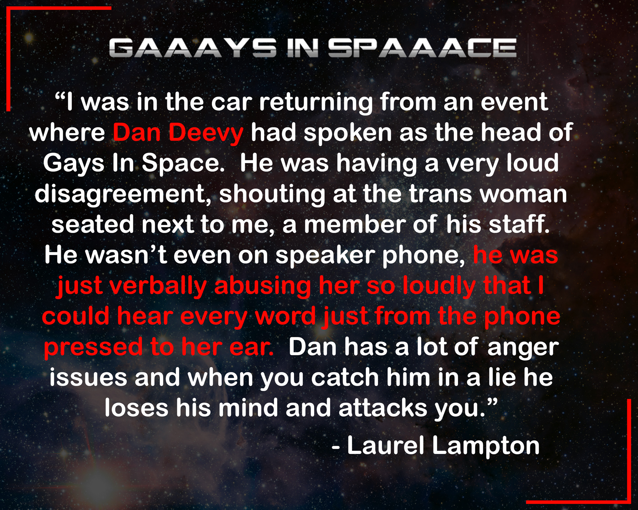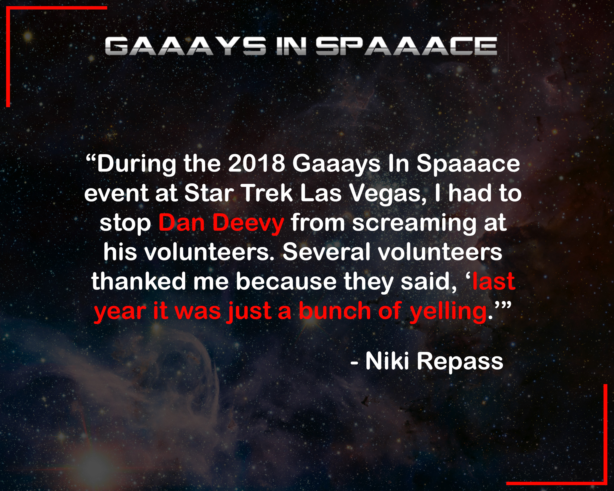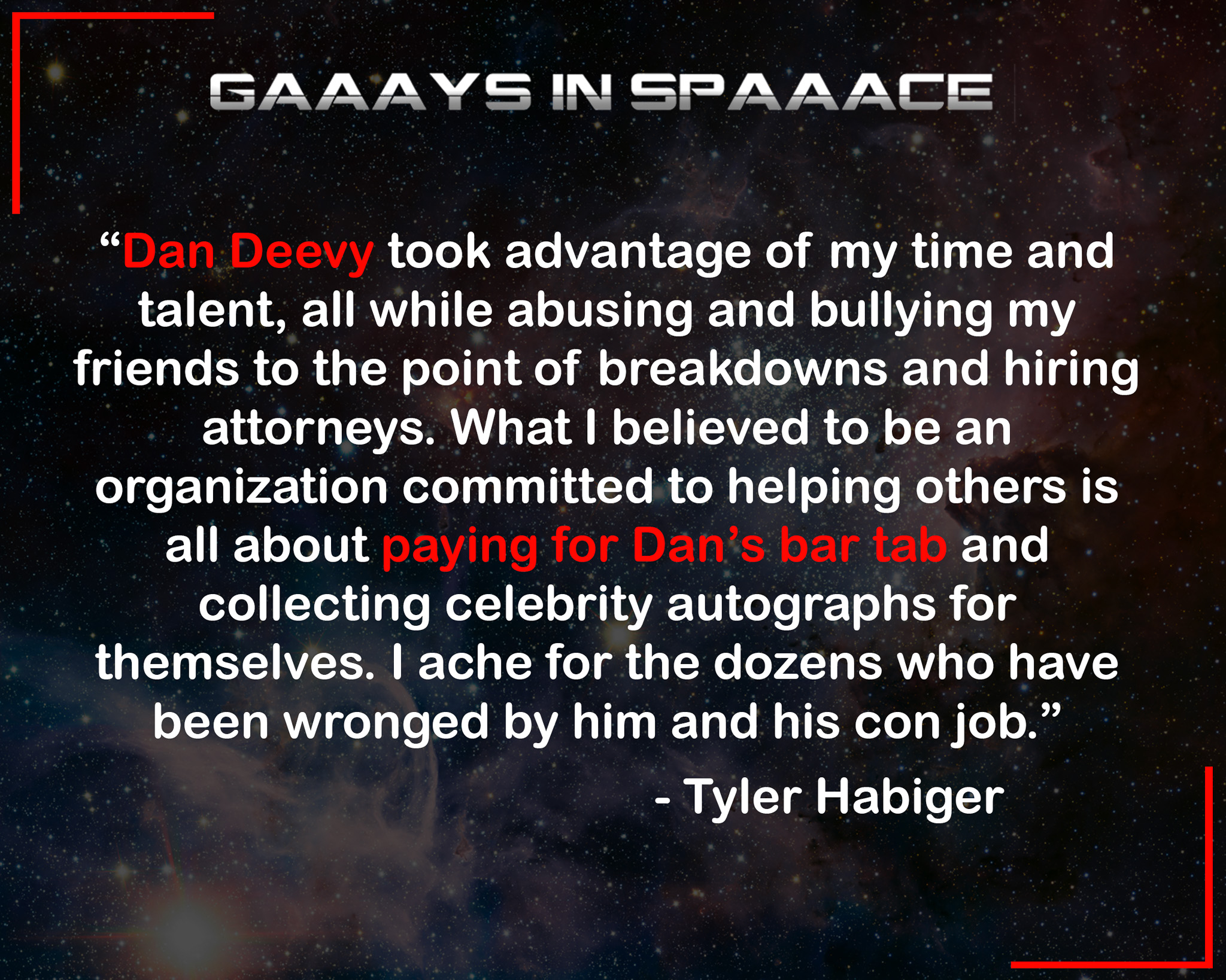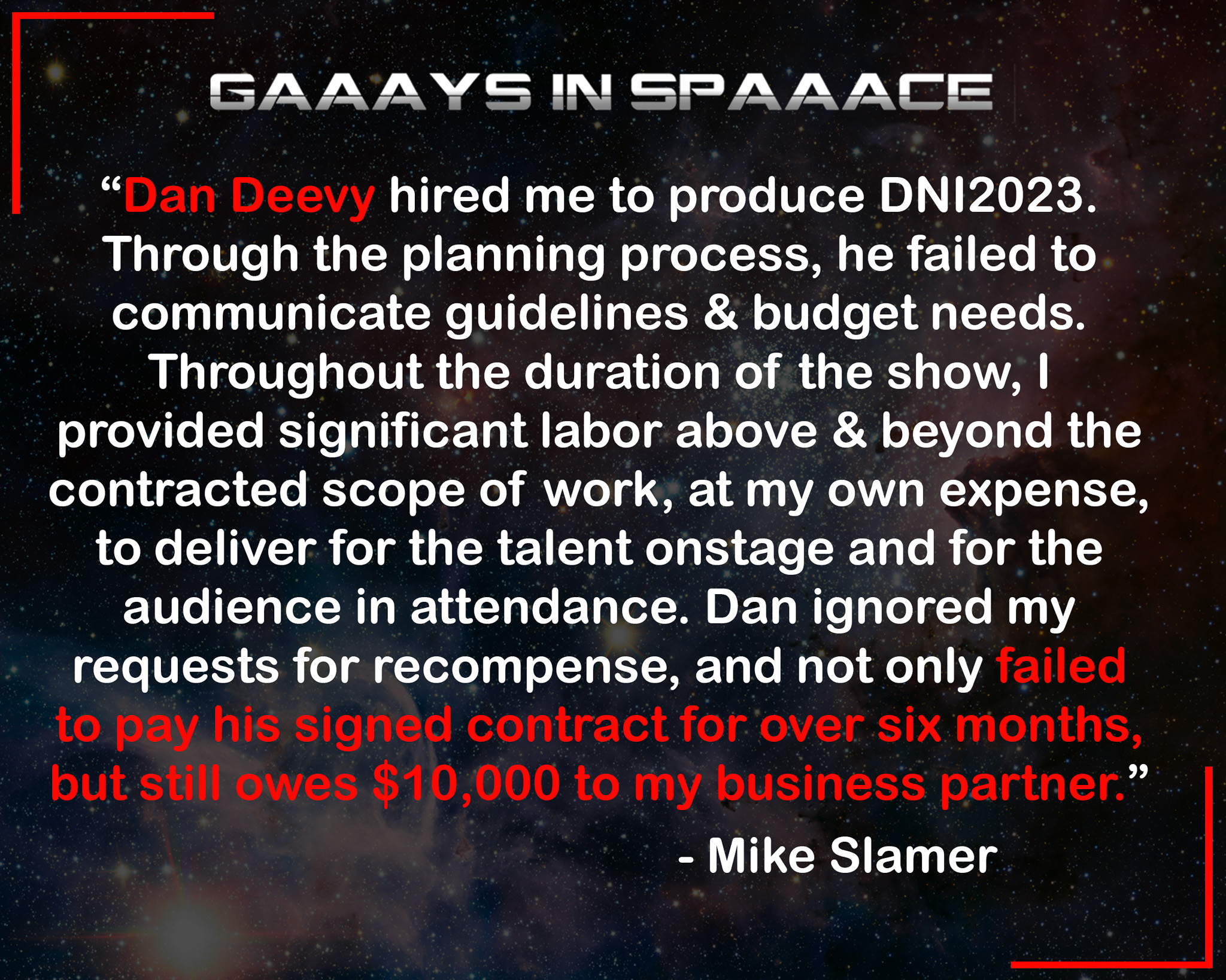 This is an important point. We respect the mission of Gays In Space as they state it, and we agree that a small number of people had a good time at D&I Con, but you can’t carry on year after year owing people tens of thousands of dollars. Those handful of people who benefit are not worth the cost of so many people Dan Deevy has wronged, and continues to wrong, and the lies he tells to attack anyone that tries to hold him accountable.