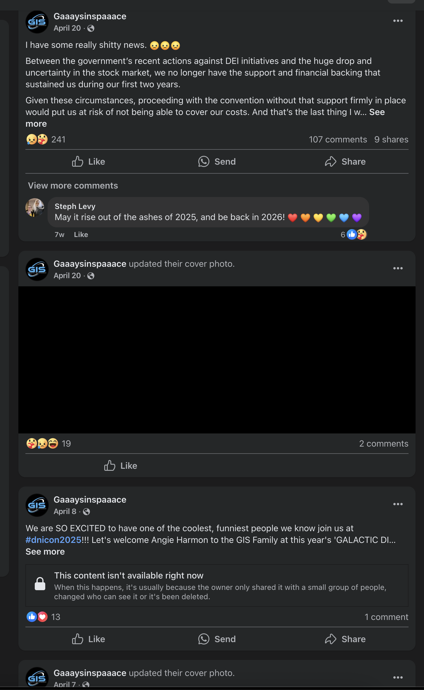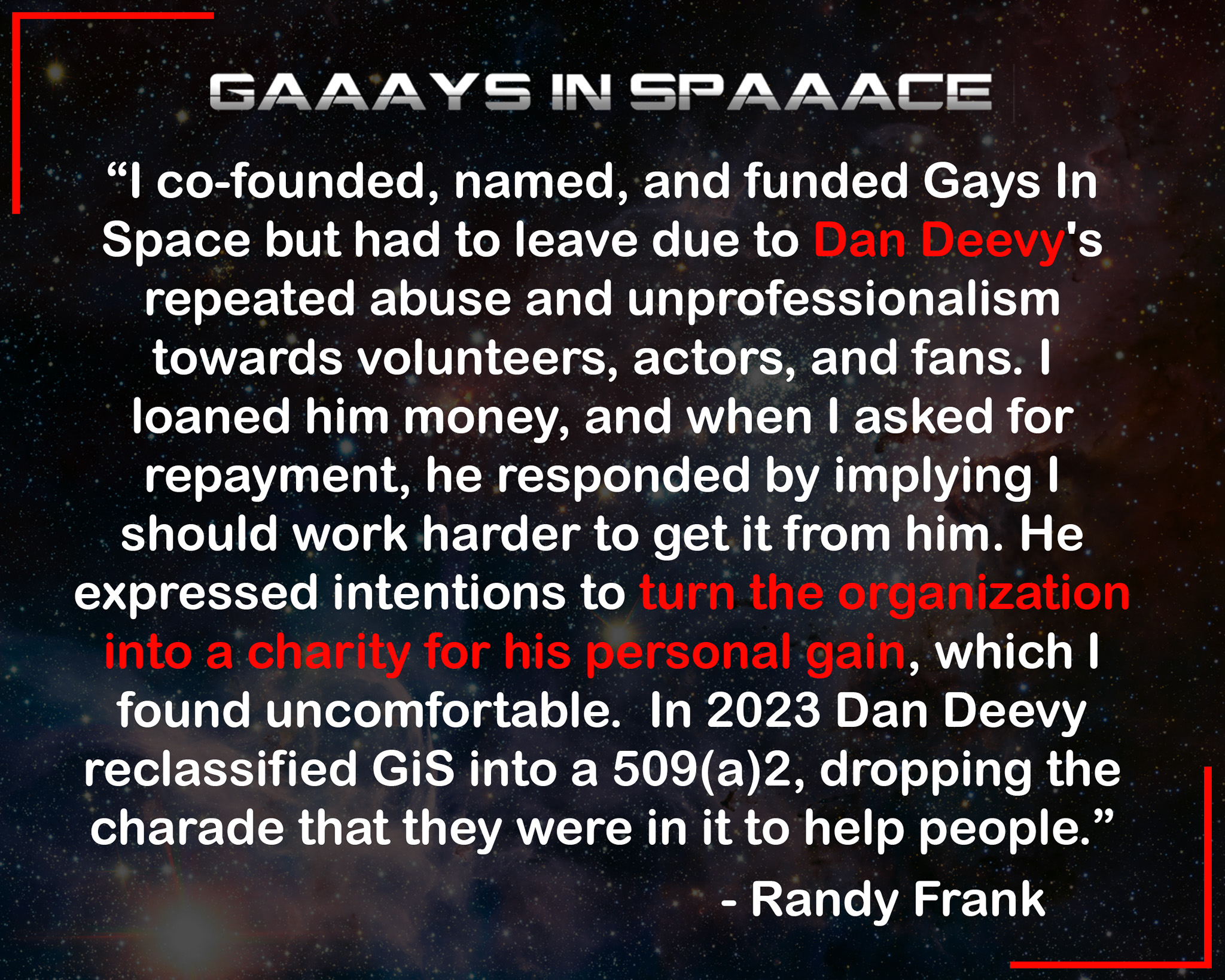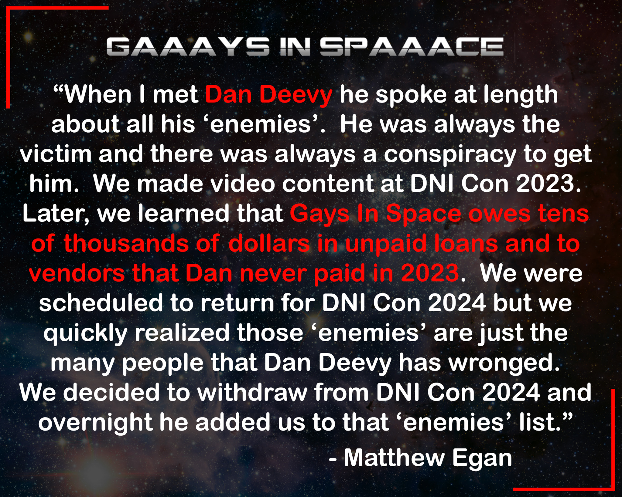 Deevy does not go into detail on which lies he imagines lead to this outcome, but Gays In Space is in the process of losing their non-profit status via the California Attorney General and people are still waiting for their 2025 D&I Con refunds. On top of these recent matters, the A/V vendor from 2023 D&I Con is still owed over $10,000 and a $15,000 personal loan remains unpaid by Deevy.