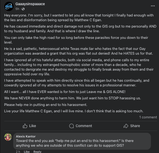 Laurel Lampton stated, “I have had people threaten me with violence and before today they had no way to know where we lived. Dan Deevy posting our home address from both the official Gays In Space page and his personal page is a violation of our privacy and information we never would consent to have him posting online. My first call after the posting was to local PD to file a police report.”