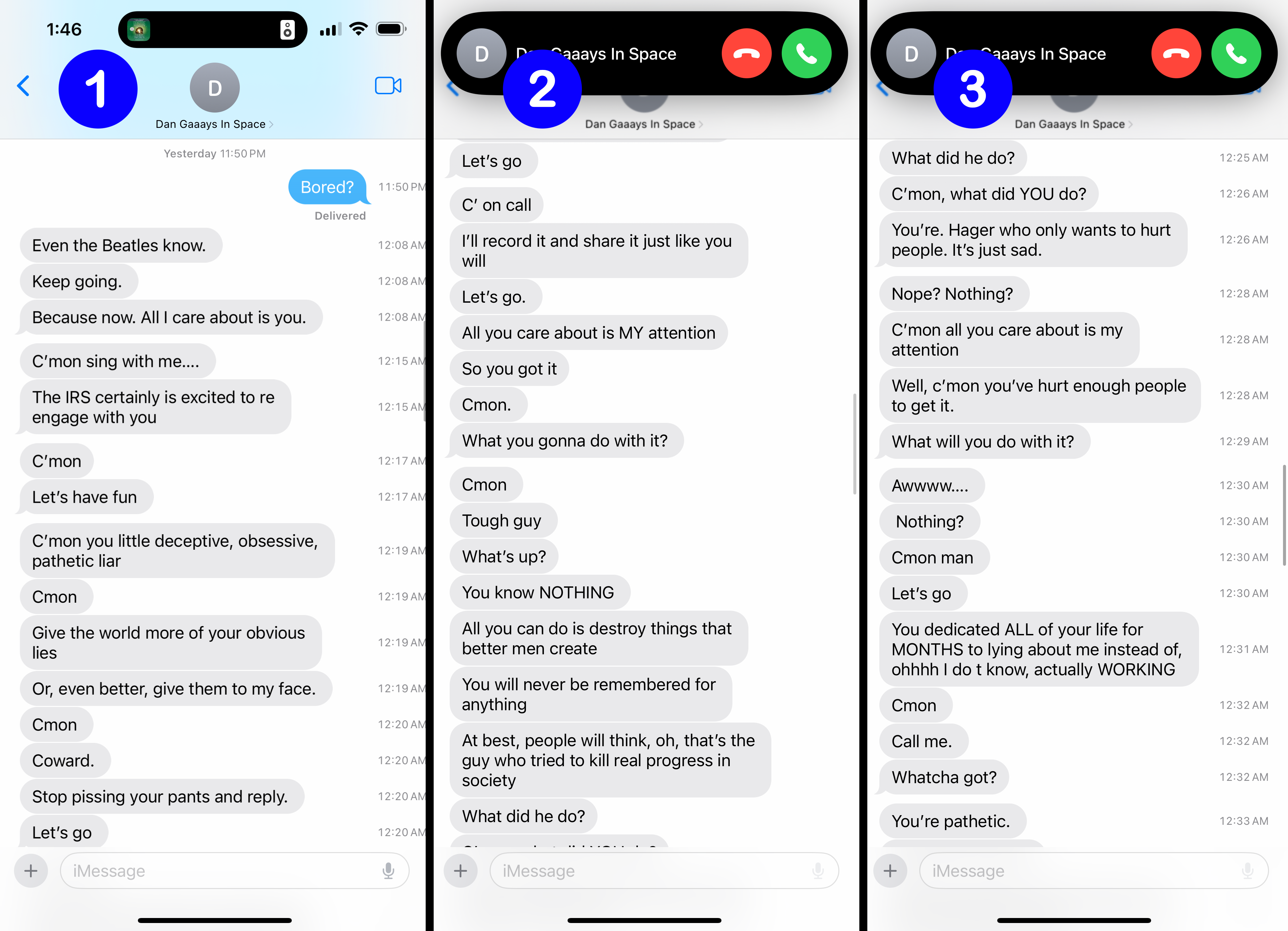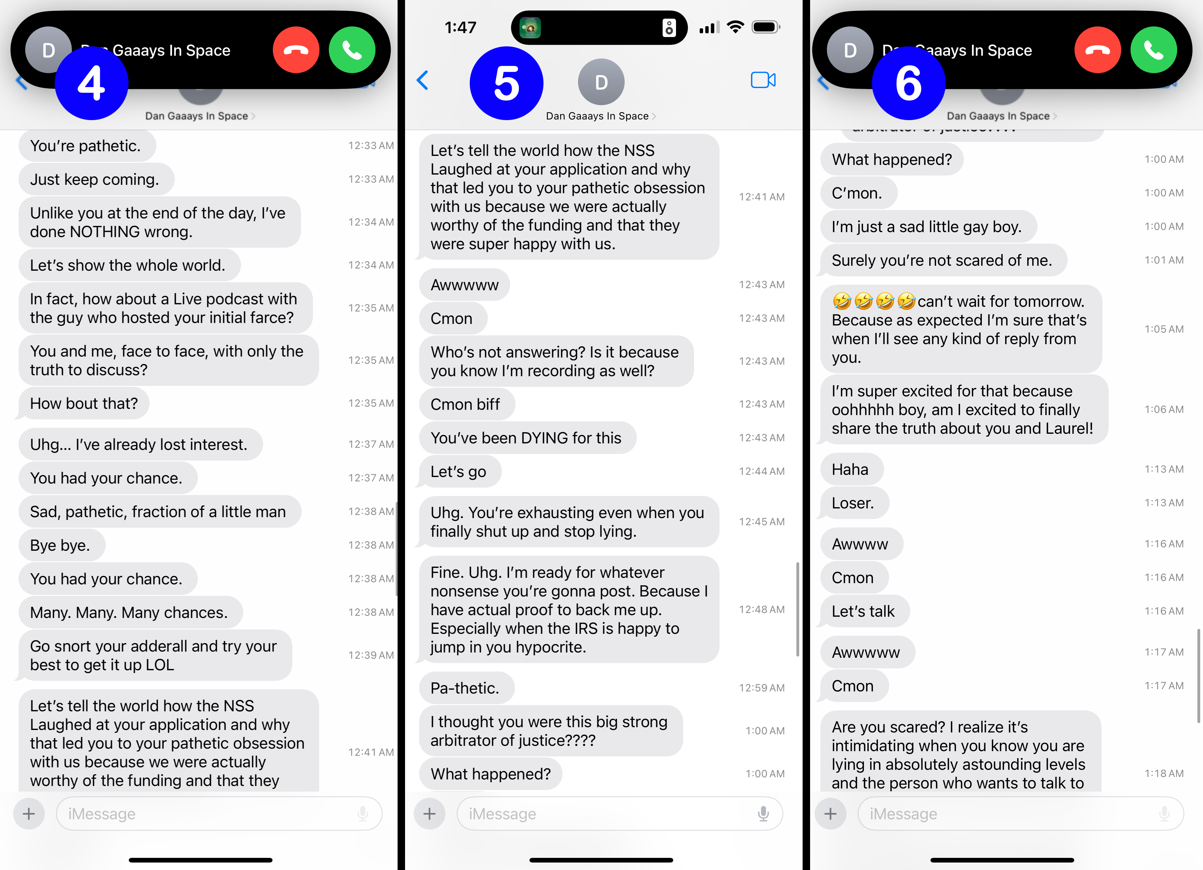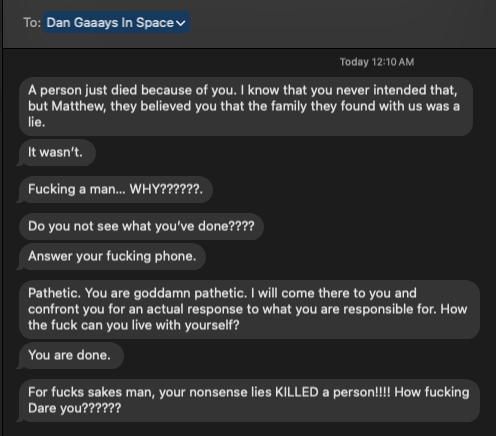 Very little contact has been had with Dan Deevy since the 2024 D&I Con, though they have started selling tickets for a 2025 event despite not having a venue locked down yet. On the night of Tuesday, June 25th at 11:51PM Matthew Egan began receiving calls from Dan Deevy. Dan would call and then immediately hang up, call and hang up. Dan called Matthew 140 times, sent 95 text messages and left 30 voicemails. At 2AM Deevy created a post on GaaaysInSpaaace’s Facebook and on his personal Facebook that tried to label Matthew as homophobic. [VIEW THAT POST HERE]