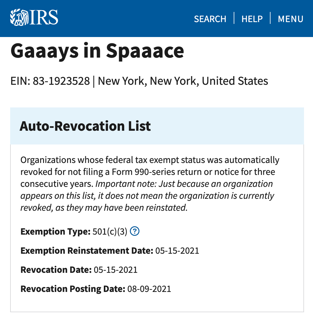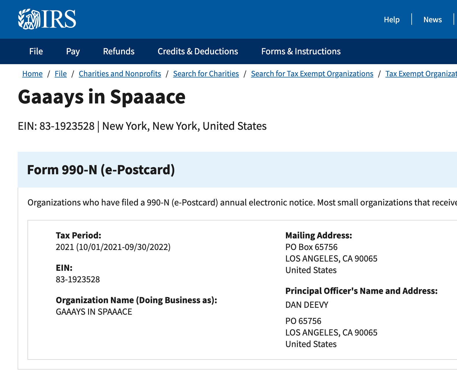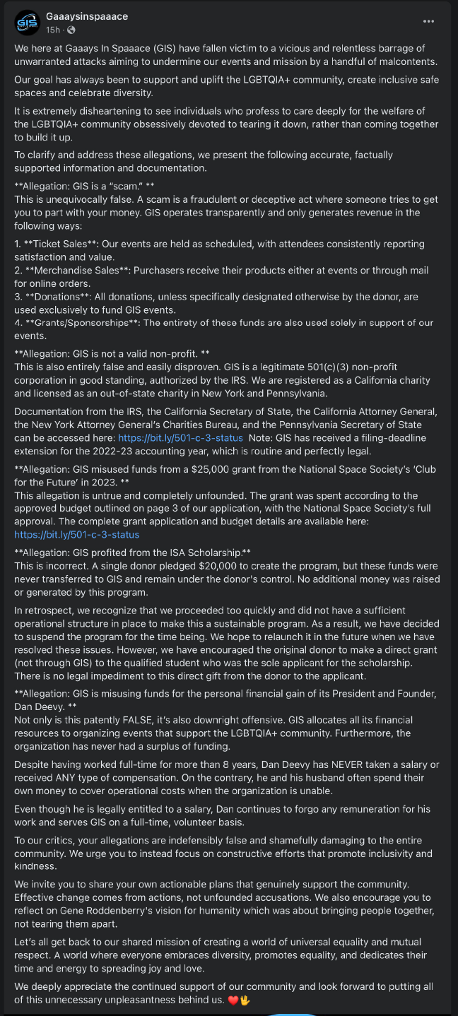 Charity Navigator doesn’t allow you to donate to them due to California Assembly Bill 488 preventing platforms from sending donations to delinquent organizations and the IRS website shows the last required 990 filing from Gays in Space was submitted in 2022. More than a little late Dan.