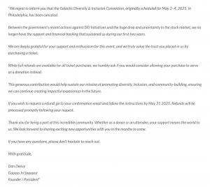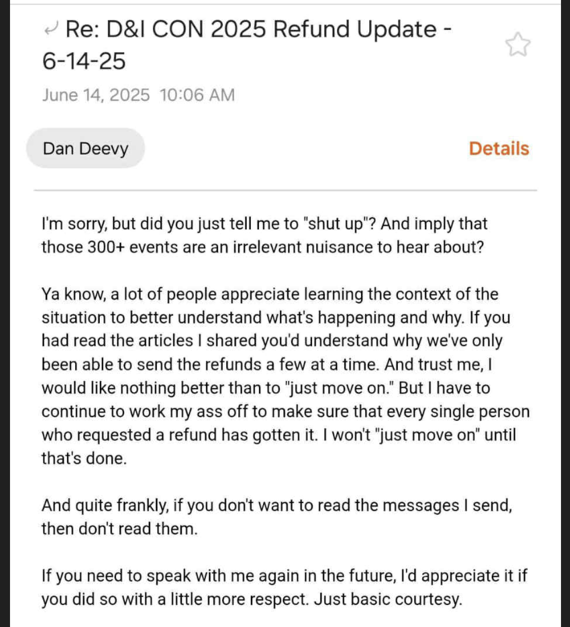 He was hoping last minute sponsorships and donations would bail him out, but people don’t donate to non-profits who are three years behind on their tax filings, that had 17 board members resign on the same day after Deevy’s 2024 D&I Con disaster, and that owe tens of thousands of dollars to vendors (and now attendees) that they stiffed. Every year he just burns somebody new, as his event shrinks.