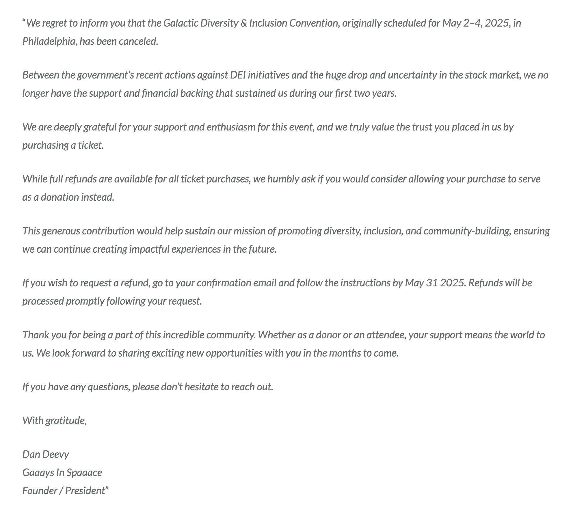 Unable to give refunds, Dan Deevy sent a long email to ticket holders from the failed 2025 D&I Con with a laundry list of excuses. In the email Deevy lists other LGBTQIA+ events that have struggled this year due to Trump and issues with the economy. The problem is Deevy compares Gays In Space with massive organizations like The Kennedy Center or New York Pride. Deevy last filed his federal 990 as a non-profit in 2022 and they did not even make the minimum $50,000 required to file a full 990, instead filing the 990-N ‘e-postcard’ used by very small nonprofits. The Kennedy Center that Dan Deevy compares himself to in this email, has an annual operating budget of $268 Million.