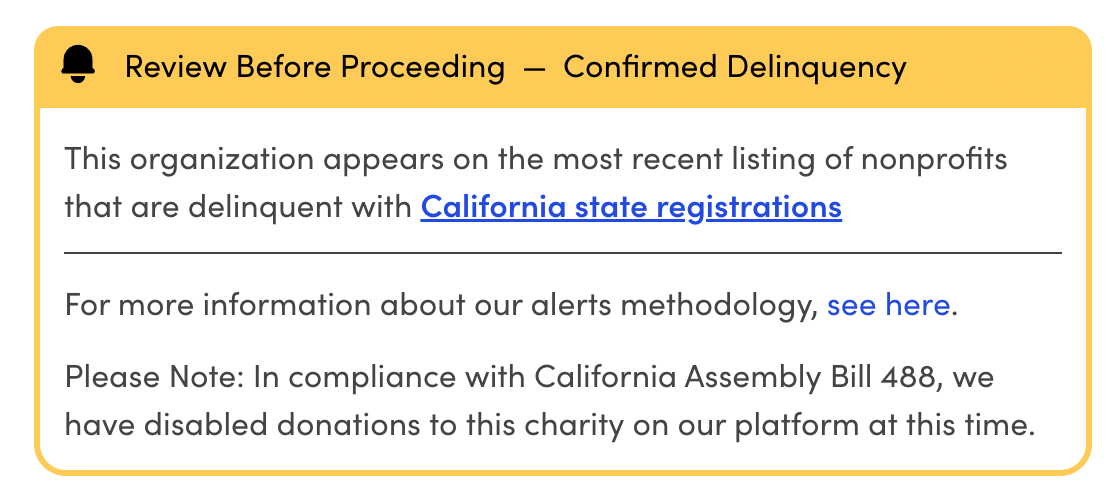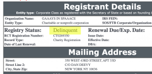 Charity Navigator further states, “In compliance with California Assembly Bill 488, we have disabled donations to this charity on our platform at this time.” That is because it is unlawful for a delinquent non-profit to operate or solicit while their status is incomplete.