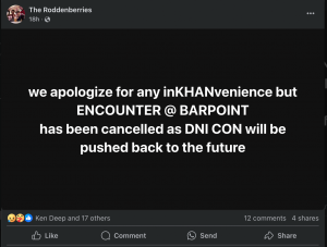 DNI Con 2025 has been cancelled. As of my writing this neither Gaaays In Spaaace nor Dan Deevy himself have posted to their Facebook or Instagram page. Their last post was April 8th, it is now April 20th, so 12 days with no messages less than two weeks to the event. The only public statement we are currently aware of is by the band “The Roddenberries” cancelling their concert because DNI Con 2025 isn’t happening. Their post uses the postponement language of “pushed back”.