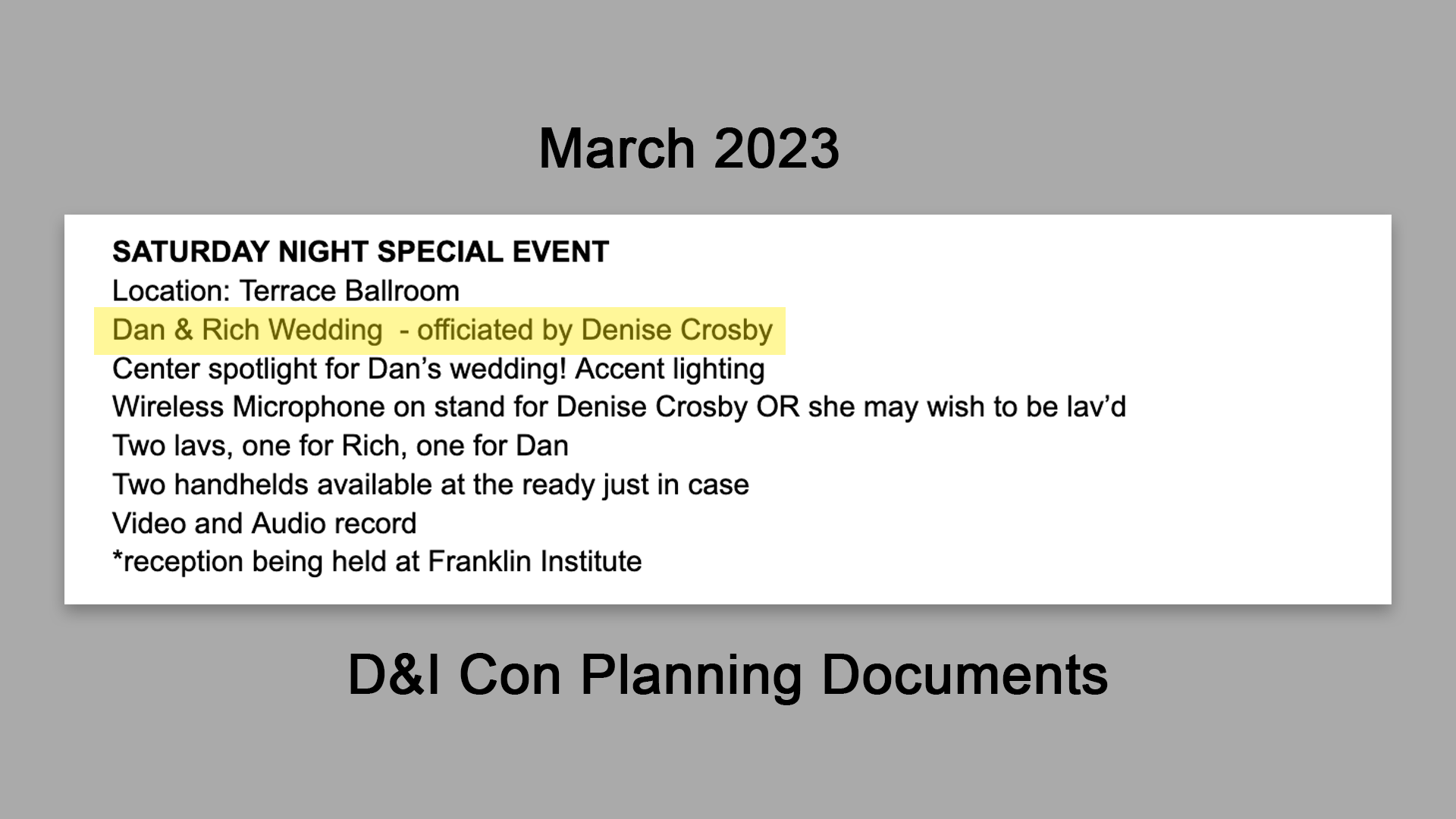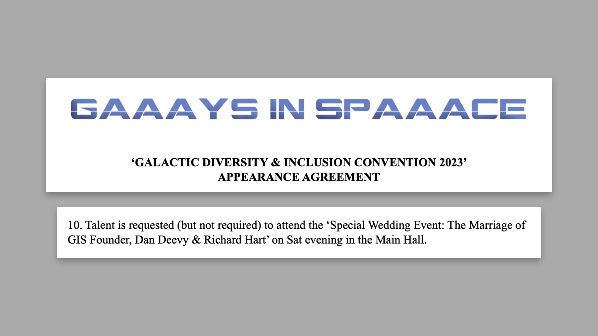 Celebrity Guests to D&I Con also had it in their contract stating: “Talent is requested (but not required) to attend the ‘Special Wedding Event: The Marriage of GIS Founder, Dan Deevy & Richard Hart’ on Sat evening in the Main Hall.”