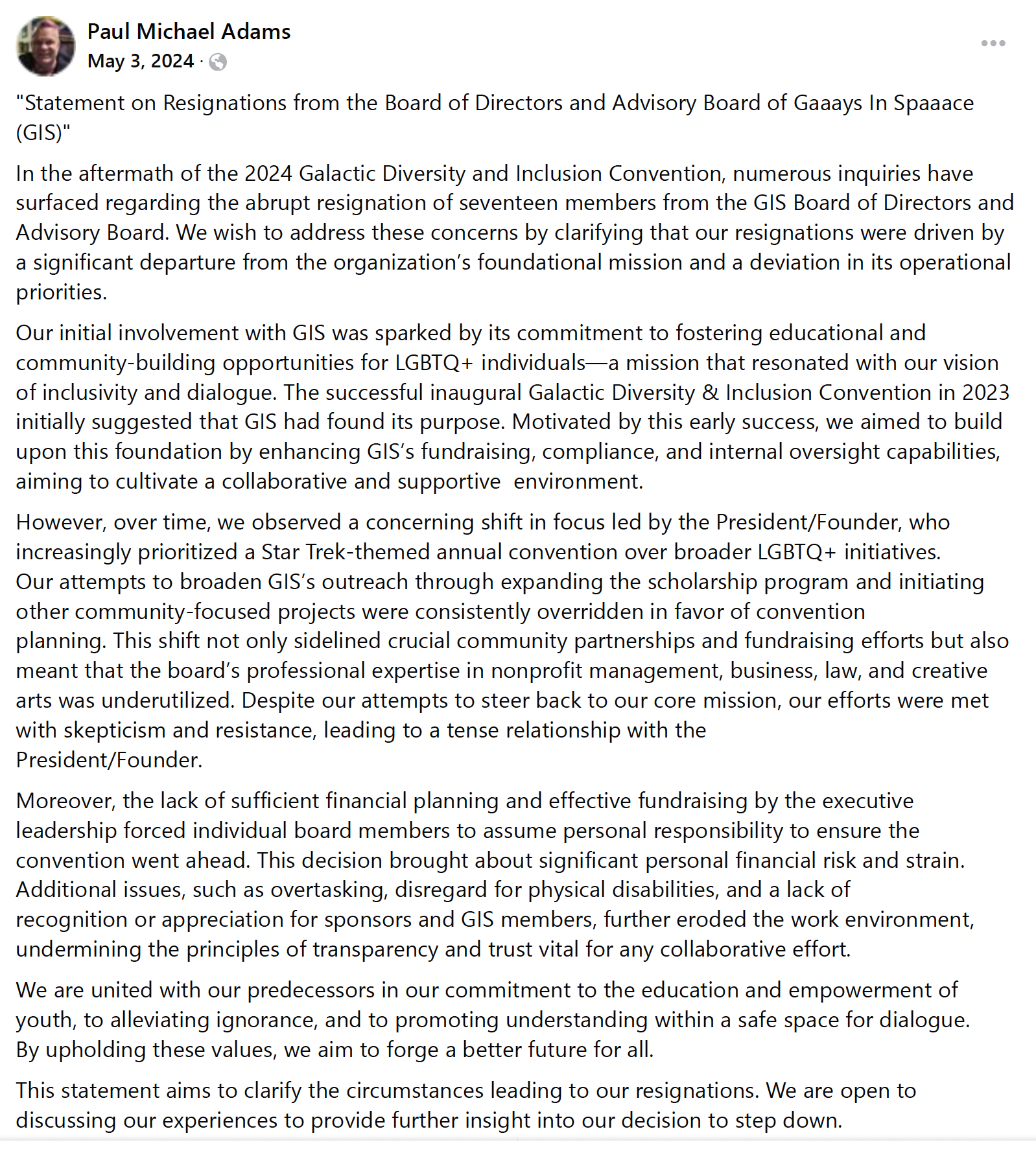 It has been five days since D&I Con 2024 and four days since Gays In Space Chairman of the Board Paul Michael Adams has resigned due to Dan Deevy’s constant fraud and providing an incomplete financial picture of Gays In Space finances. The “Our Team” page has been removed from the Gays In Space website, but we took screenshots of that page prior to it being removed – we are told every member of the board of directors and most members of the advisory board are resigning from Gays In Space because of Dan’s behavior. [CLICK HERE] for a PDF with the Board of Directors and Advisory Board as it was listed during D&I Con 2024.