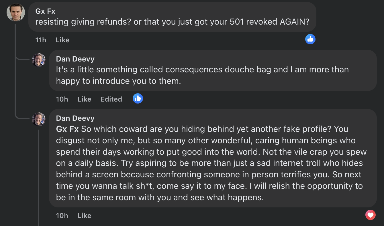 Deevy went ballistic, stating “So which coward are you hiding behind yet another fake profile?” People comment on Deevy’s post using fake profiles because he bans anyone from commenting that even remotely disagrees with him or calls him out for all of the people he owes tens of thousands of dollars to. An interesting behavior for a non-profit that is meant to serve the public good.