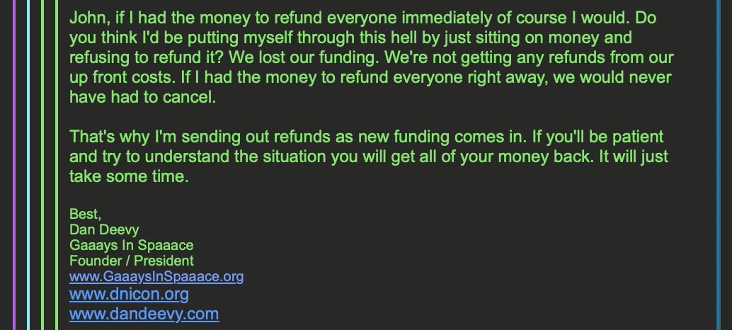 Concerned attendees forwarded Deevy’s email to our lies@gaysinspace.org tip line and one replied to Deevy chastising Gays In Space for “being overly verbose” instead of “just shutting up and giving everybody their refunds and moving on”. Deevy replied, “Did you just tell me to shut up and imply that those 300+ events are an irrelevant nuisance to hear about?”