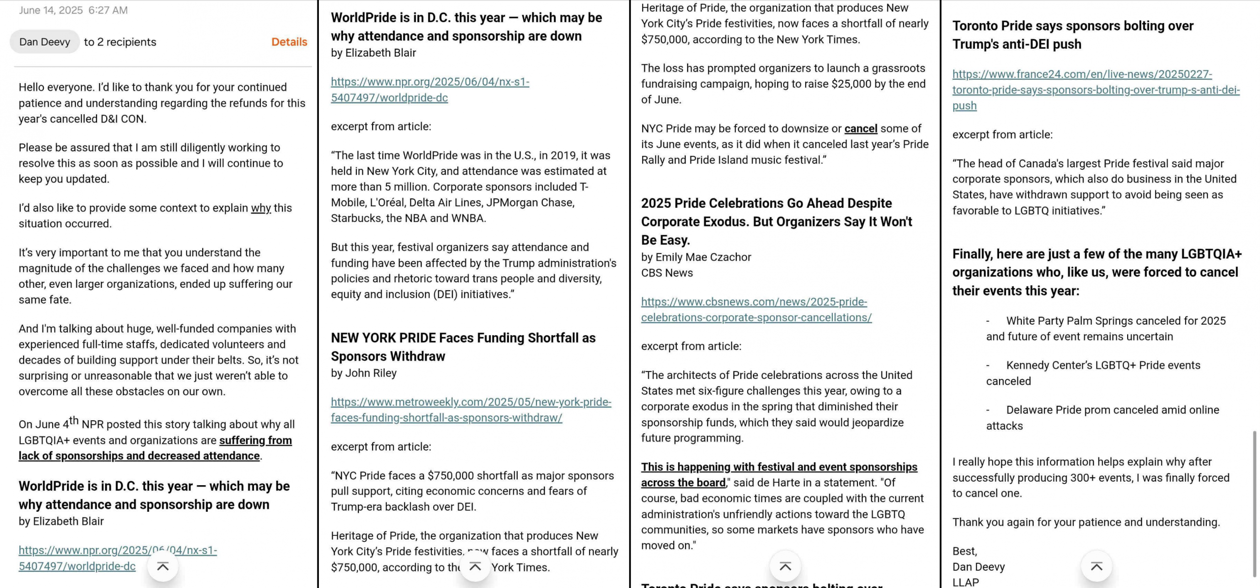 It has been 15 days since Dan Deevy canceled DNI Con for 2025. 15 days since he emailed attendees telling them they have until May 31st to request a refund. Today an article was published out of Philadelphia about those who have so far been unable to get their refund, and no one has been able to reach Dan Deevy. The article states: “organizers did not update the ticket page for days and the Gaaays in Space website still advertises the event as an “EPIC.. once in a lifetime opportunity!!!”