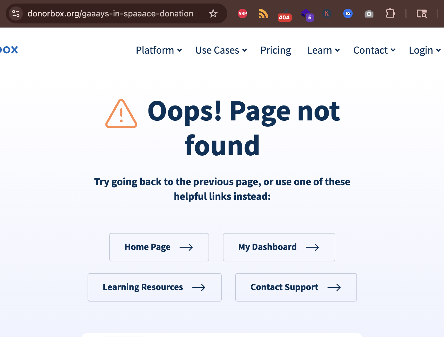 Following this action if you go to the Donate button on the Gays In Space website, it simply gives you this error that the donation page can no longer be found.